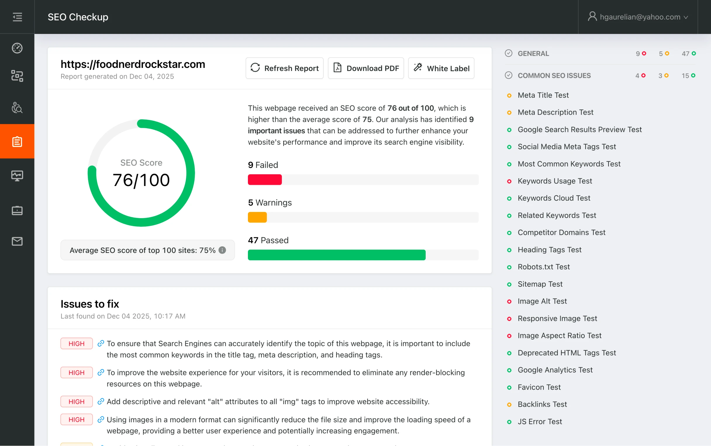 Managing 20+ client sites used to be chaos. SEO Site Checkup's dashboard lets us monitor everything in one place and catch issues before clients do.